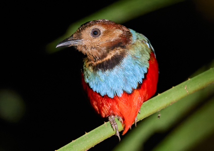 Dumaga-Bone National Park is the largest area of forested wilderness in North Sulawesi, a half day journey from Gunung Mahawu and Manado. There are a number of access points to this area that harbours a mouth-watering selection of Sulawesi’s birds but one of the most anticipated is the Tambun Maleo Conservation Area. Here there is a hide overlooking an area frequented by this giant megapode which incubates its eggs using geothermal heat from the soil within which its deposits its eggs. negotiating the trails at Toruat gives birders another superb access point for a few days of birding here and on this visit we caught up with a splendid roosting Sulawesi Pitta.