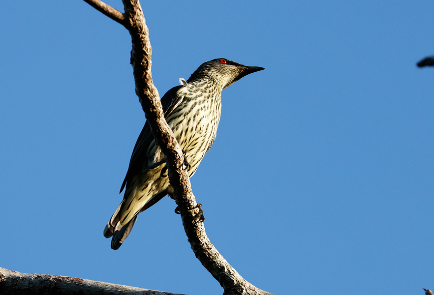 This morning a lot of birds were perching on exposed branches and in this way we got far improved views of Ivory-backed Woodswallow as they sallied for prey at close range. A big flock of Finch-billed Mynas joined them and a female Ashy Woodpecker gave us exceptional views. Adding to the list of birds that gave great views were a few Yellow-breasted Racket-tails that came to feed in a nearby tree while their cousins, Golden-mantled Racket-tails, only gave flypast sightings. Sulawesi Myna, with its wild bushy crest, was another top-quality bird that entertained us here, that we did not see on previous visits with another nice display by White-necked Mynas to enjoy too.